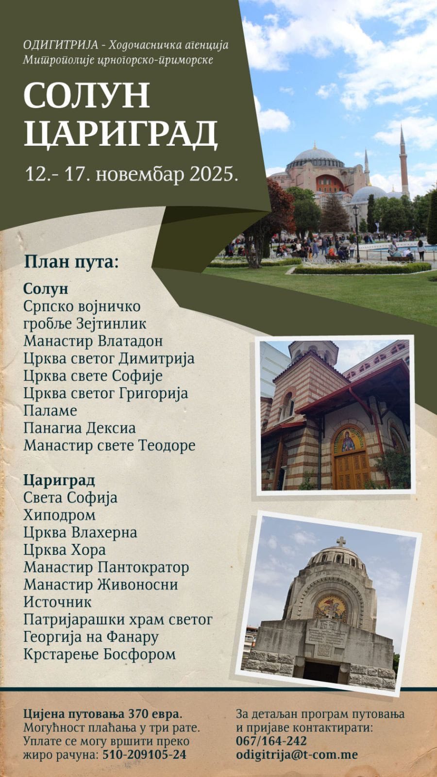 Одигитрија, ходочасничка агенција Митрополије црногорско-приморске, од 12. до 17. новембра, организује поклоничко путовање за Солун и Цариград.