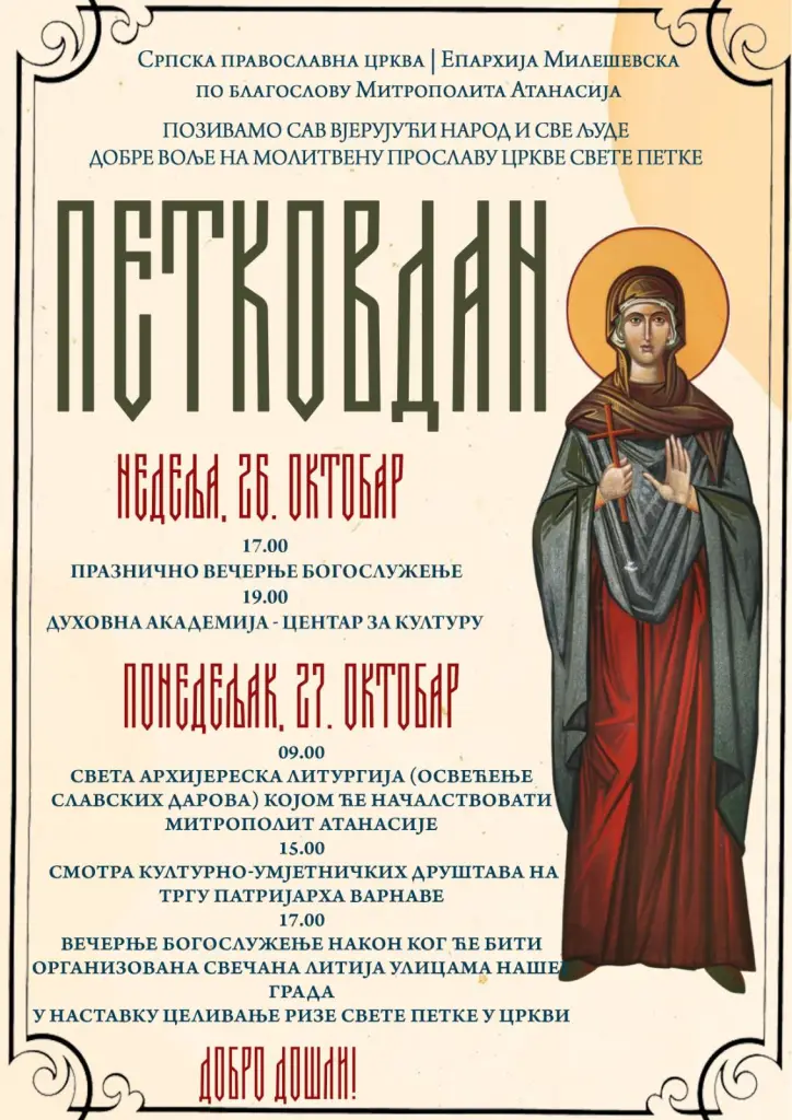 Тим поводом ЦО Пљевља и управа храма Свете Петке позивају све да узму учешћа у предстојећим славским свечаностима.