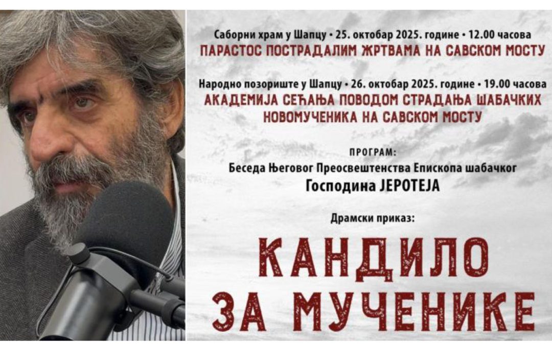 Сутрадан, 26. октобра 2025. године, са почетком у 19 часова, у Народном позоришту у Шапцу биће одржана академија сећања на којој ће беседити Преосвећени Епископ шабачки г. Јеротеј. По беседи ће, као апотеоза свечане академије сећања, уследити драмски приказ Кандило за мученике.