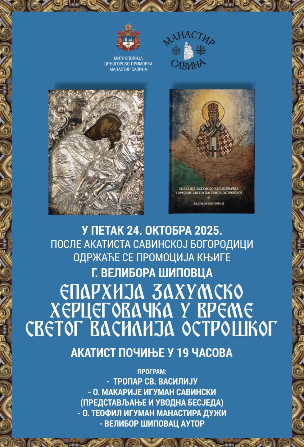 У петак, 24. октобра, у манастиру Савина у Херцег Новом, одржаће се промоција књиге ”Епархија захумско-херцеговачка у вријеме Светог Василија Острошког”, аутора Велибора Шиповца.