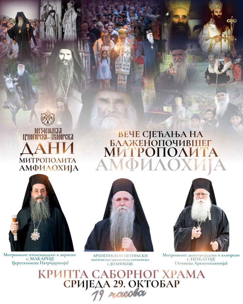У оквиру манифестације „Дани Митрополита Амфилохија“, данас, у сриједу, 29. октобра 2025. године, одржаће се вече сјећања на блаженопочившег Митрополита Амфилохија, са почетком у 19 часова.