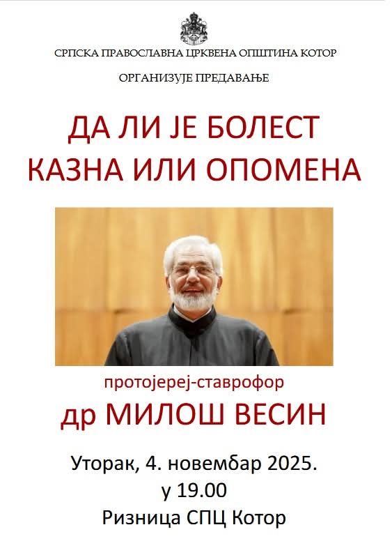 Протојереј-ставрофор др Милош Весин одржаће у уторак, 4. новембра, у ризници СПЦО Котор, предавање на тему ”Да ли је болест казна или опомена”.