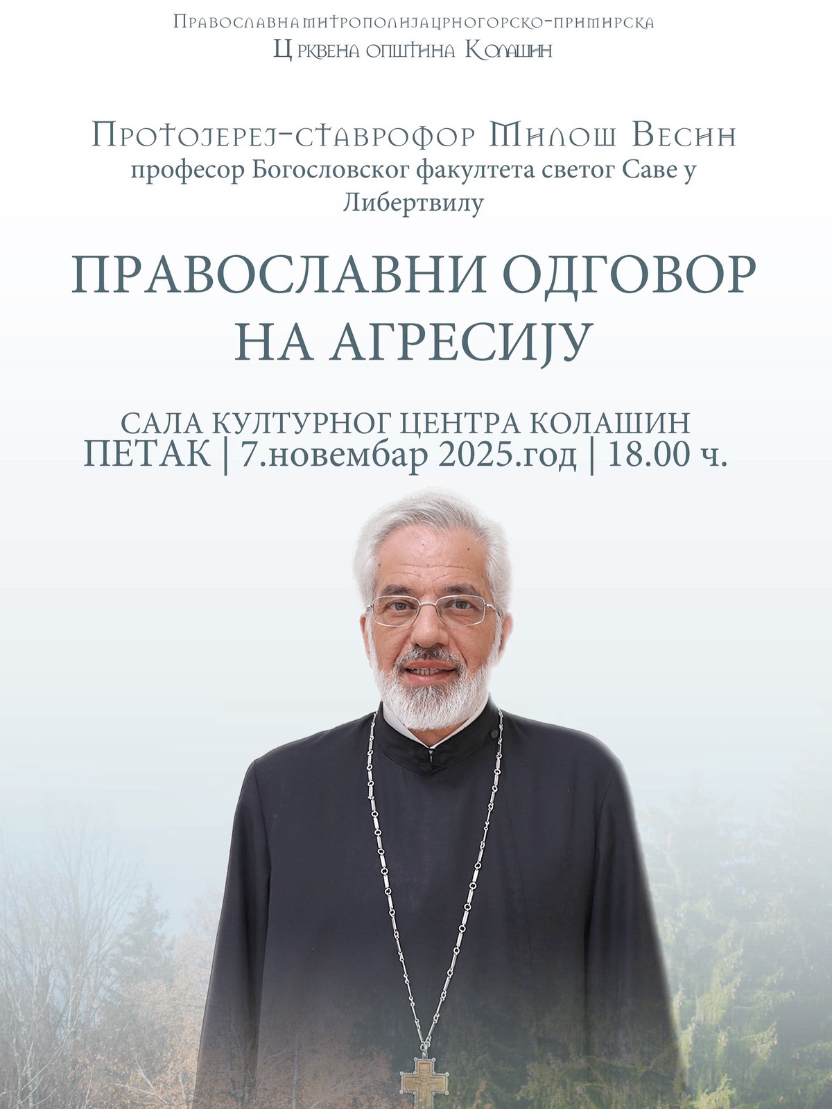 Тим поводом у петак, 7. новембра, уочи славе, биће служено празнично вечерње богослужење, са почетком у 16 часова, а потом ће, са почетком у 18 часова, у колашинском Центру за културу протојереј-ставрофор Милош Весин одржати предавање на тему „Православни одговор на агресију“.