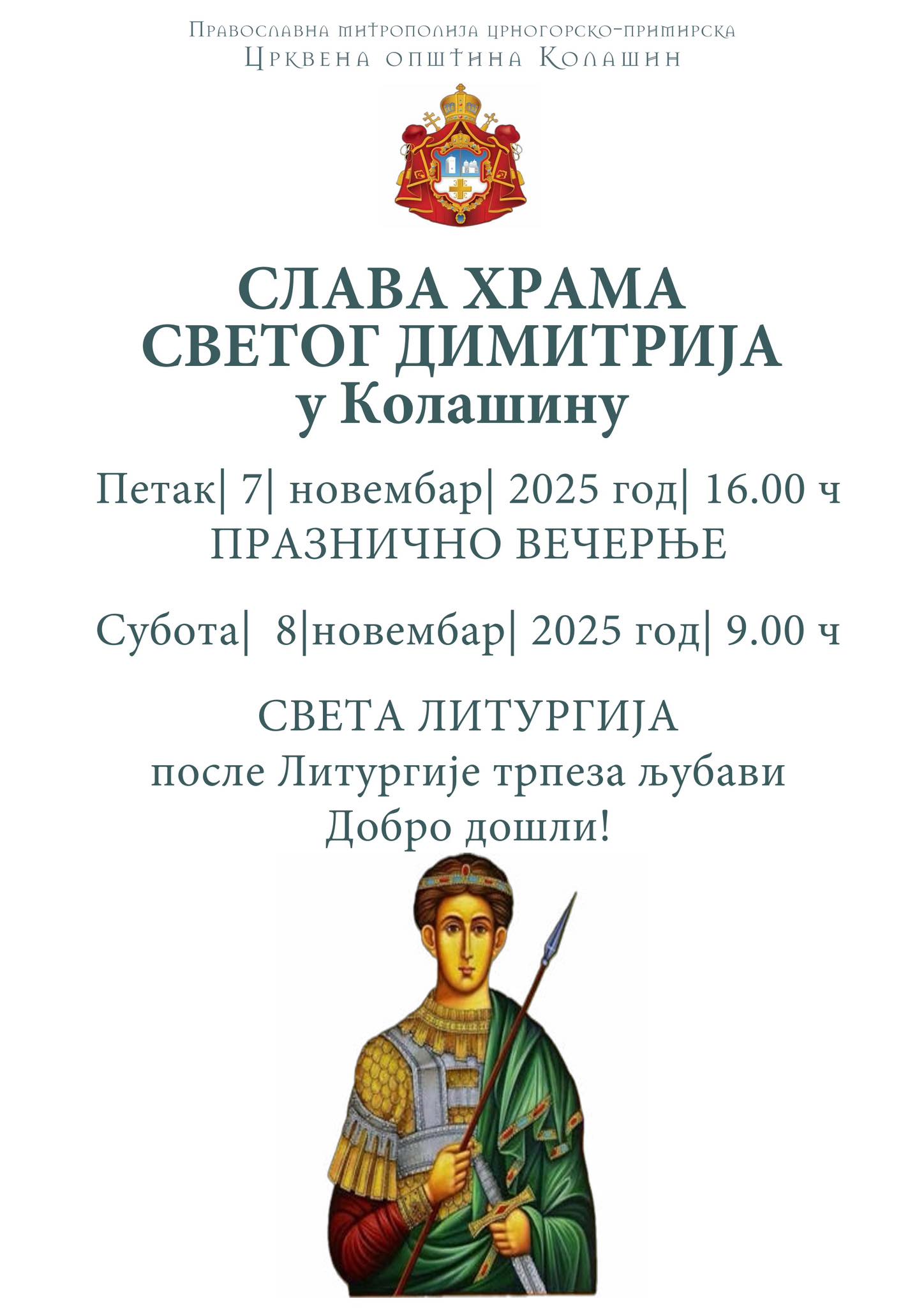 Црквена заједница при Саборном храму Светог Димитрија у Колашину прославиће на празник овог дивног угодника Божијег храмовну славу колашинског Саборног храма.