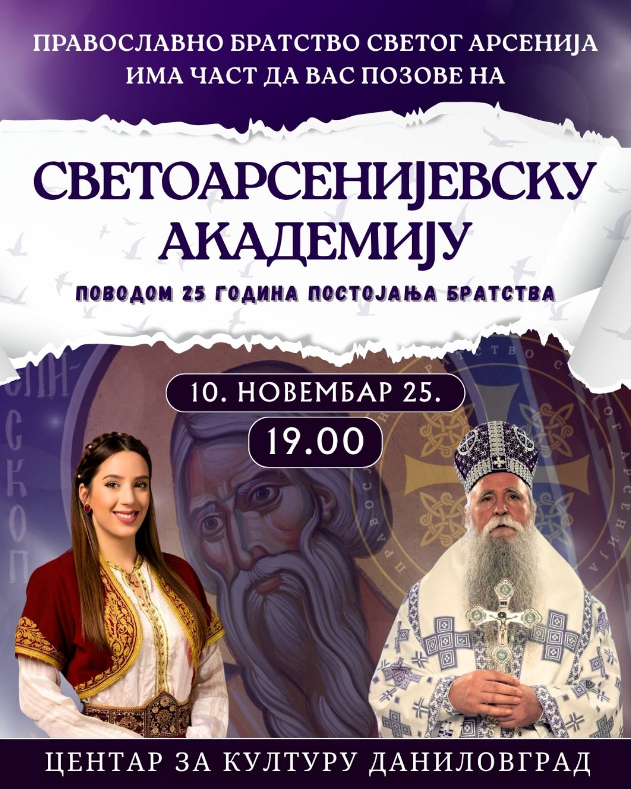 На празник Светог Арсенија, другог архиепископа српског, у понедјељак 10. новембра 2025. године, у Центру за културу у Даниловграду, одржаће се свечана Светоарсенијевска академија.