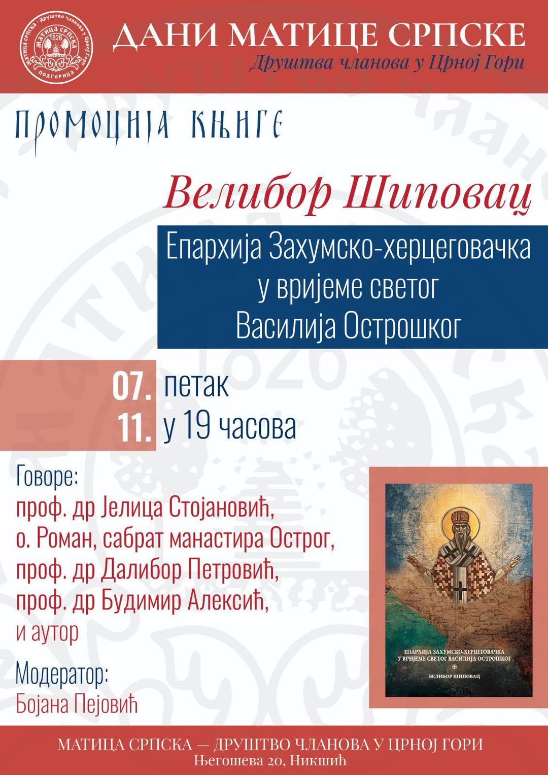 У оквиру Дана Матице српске – Друштва чланова у Црној Гори, у петак, 7. новембра, са почетком у 19 часова, у просторијама Матице у Никшићу, одржаће се представљање књиге Велибора Шиповца ”Епархија Захумско-херцеговачка у вријеме Светог Василија Острошког”.