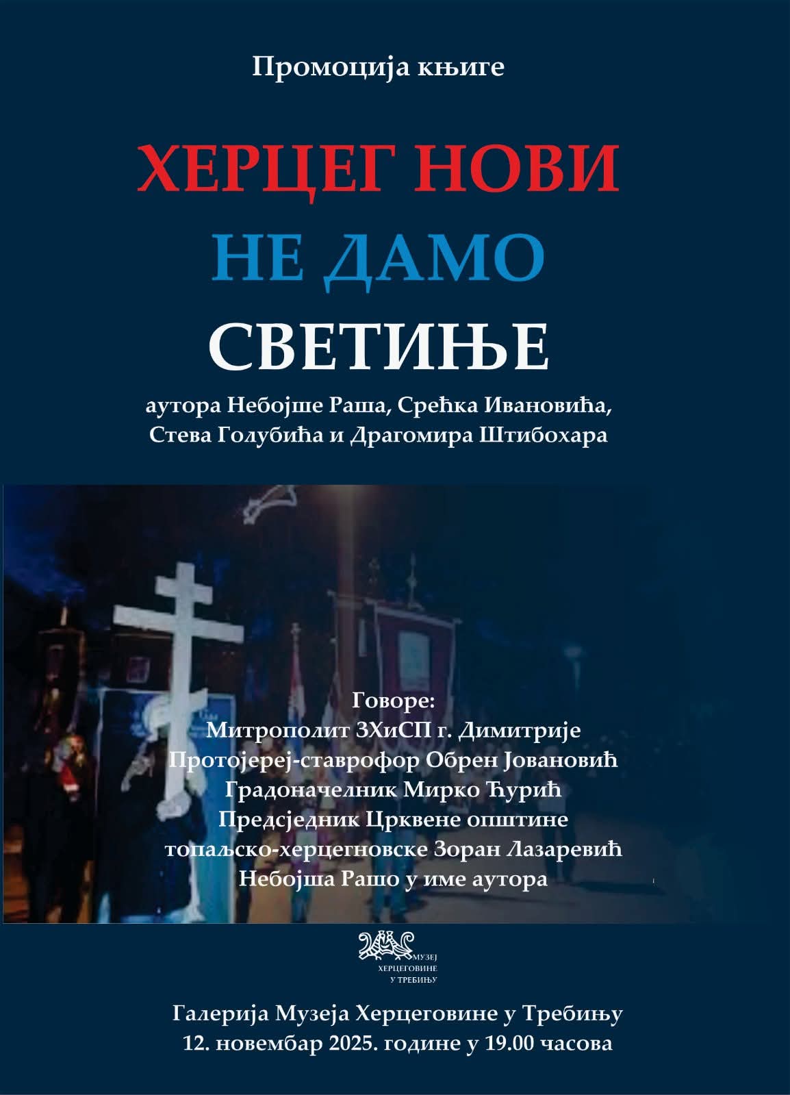 У сриједу 12. новембра, у Галерији Музеја Херцеговине у Требињу, са почетком у 19 часова, биће одржана промоција књиге „Херцег Нови – Не дамо светиње“.