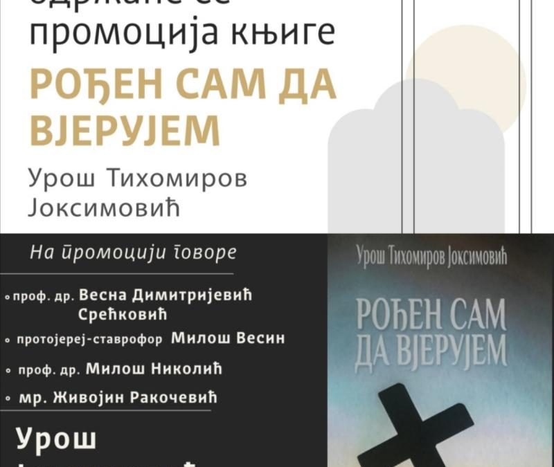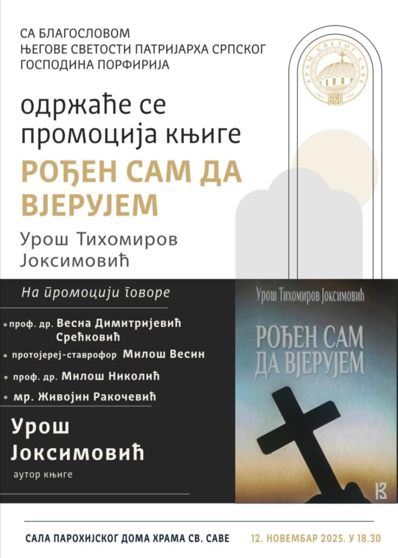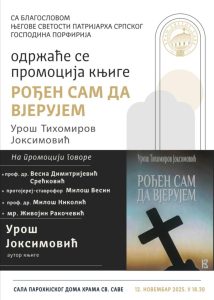 У Парохијском дому Светосавског храма на Врачару 12. новембра 2025. године од 18, 30 часова биће представљена књига под називом „Рођен сам да верујем“ Уроша Тихомировог Јоксимовића. О књизи ће поред аутора говорити и проф. др Весна Димитријевић Срећковић, протојереј-ставрофор проф. др Милош Весин, проф. др Милош Николић и мр Живојин Ракочевић.