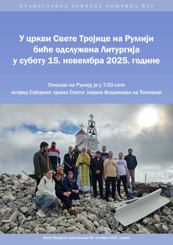 Православна црквена општина Бар обавјештава вјернике да ће се у Цркви Свете Тројице на Румији служити Литургија у суботу, 15. новембра.