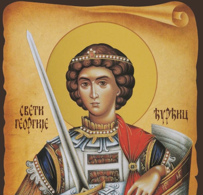 Тропар (глас 4): Јако плених свободитељ и нишчих зашчититељ немошствојушчих врач, цареј поборниче, побједоношче, великомучениче Георгије, моли Христа Бога, спастисја душам нашим.