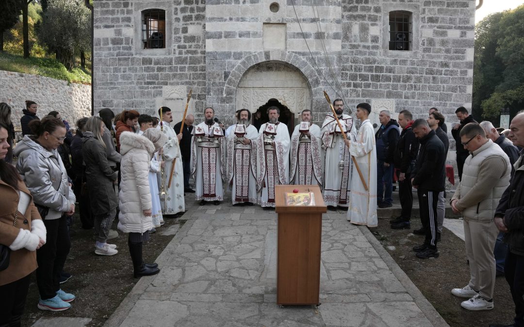 На недељни дан када се сјећамо догађаја преноса часног тијела мученика Христовог и Побједоносца Георгија из Никомидије у Лиду Палестинску (данашњи град Лођ у Израелу) одакле је касније изникла најстарија светогеоргијевска црква, одслужена је Света литургија у Храму, који је неких шест векова касније, такође, њему у част, подигнут у древној Диоклији, на територији данашње Подгорице, под брдом Горица.