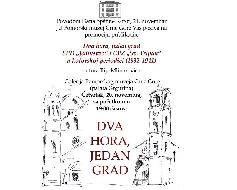 Поводом Дана општине Котор, 21. новембра, ЈУ Поморски музеј Црне Горе организује промоцију публикације „Два хора, један град – СПД Јединство и ЦПЗ Св. Трипун у которској периодици (1932 – 1941)“ чији је аутор кустос Илија Млинаревић.