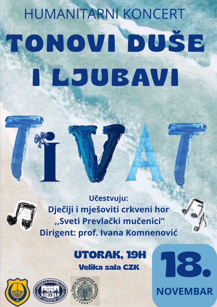 Дјечји и мјешовити црквени хор “Свети превлачки мученици” из Тивта представиће се публици у уторак, 18. новембра хуманитарним концертом “Тонови душе и љубави” у 19 сати у Великој сали Центра за културу Тиват. Под диригентском палицом проф. Иване Комненовић, Хор ће наступити на Новембарским данима, као поклон граду за рођендан, изводећи претежно репертоар који обухвата традиционалну, народну и фолклорну музику.