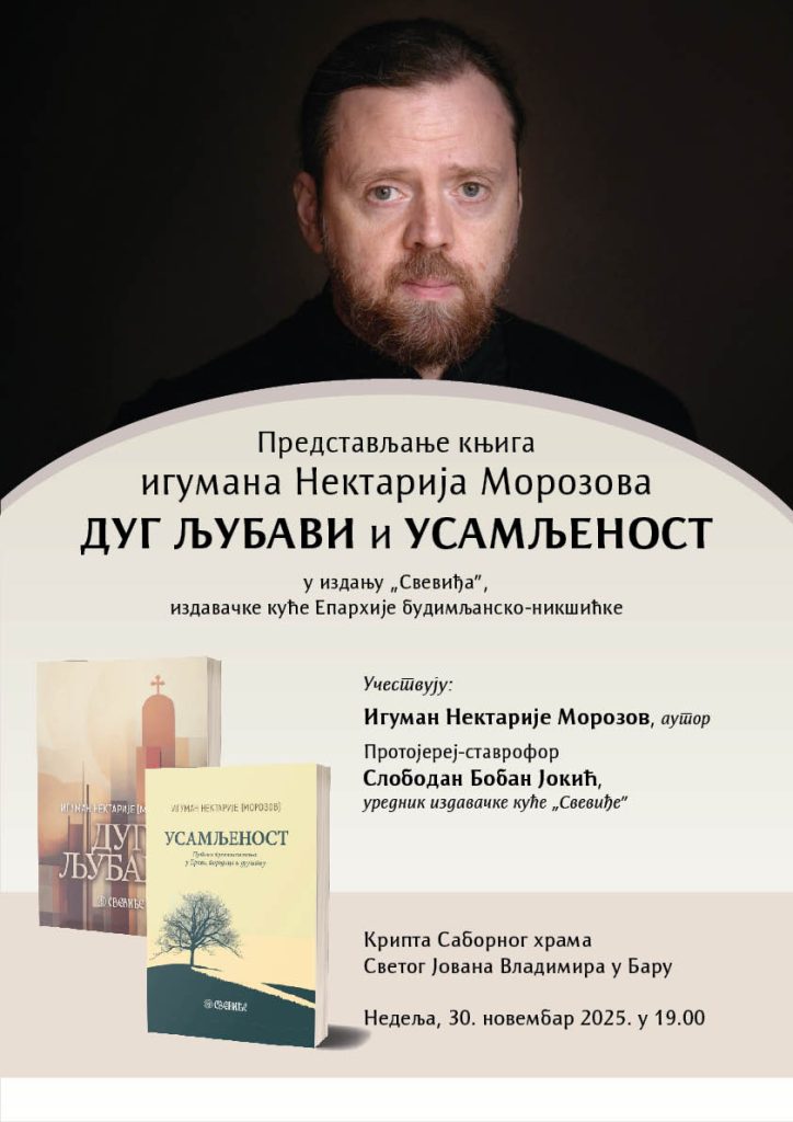 У крипти Саборног храма Светог Јована Владимира у Бару, у недељу, 30. новембра у 19 сати биће уприличено представљање књига игумана Нектарија Морозова „Дуг љубави“ и „Усамљеност“.