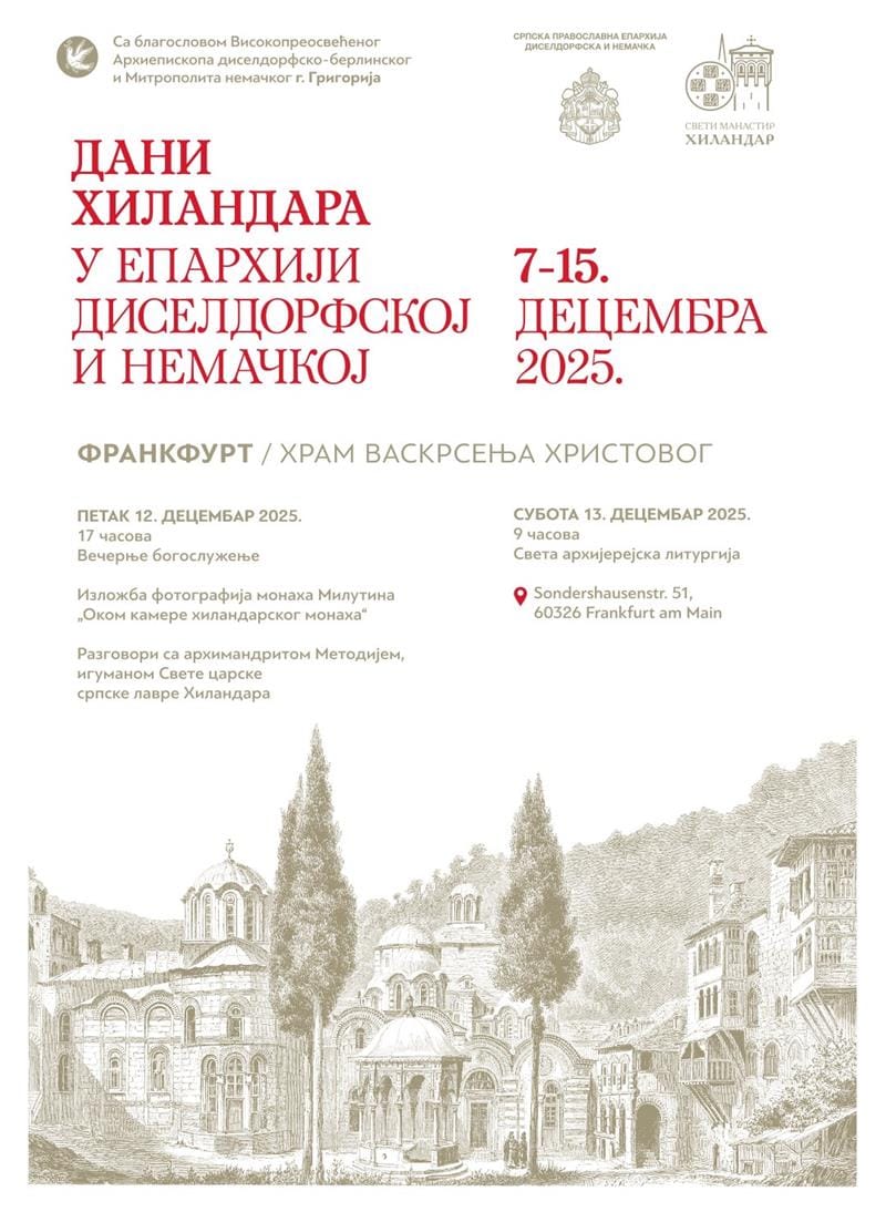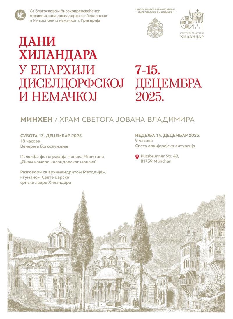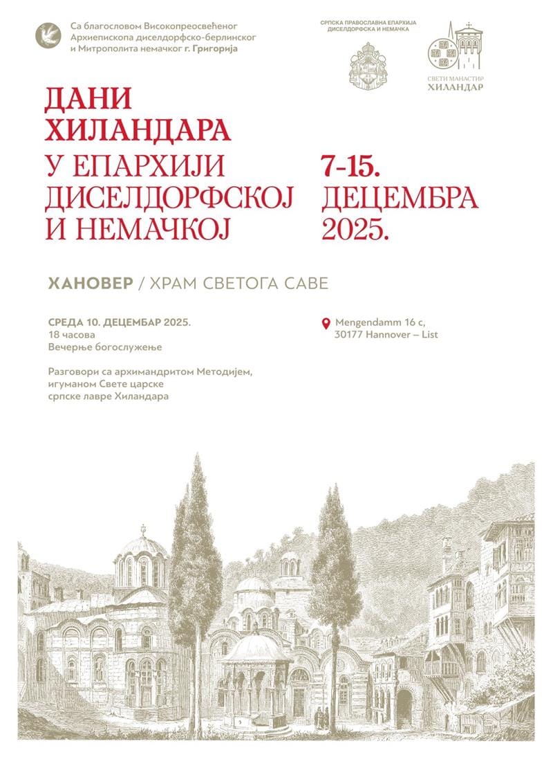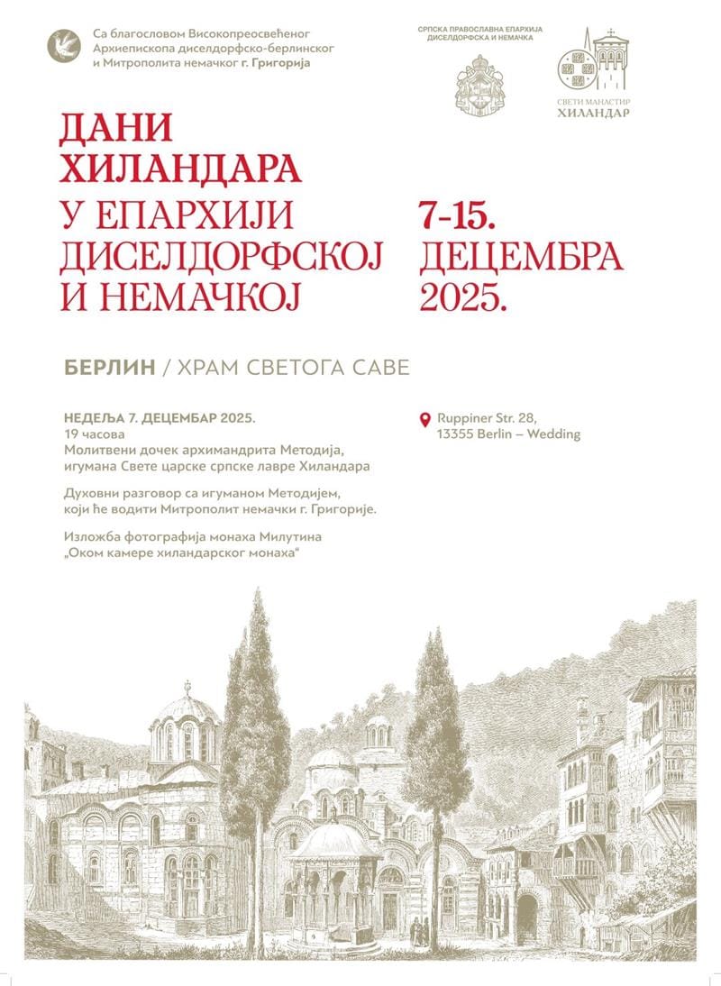 Са благословом Високопреосвећеног Архиепископа диселдорфско-берлинског и Митрополита њемачког господина Григорија у Епархији диселдорфској и њемачкој од 7. до 15. децембра одржаће се Дани Хиландара, током којих ће епархију посјетити Високопреподобни архимандрит Методије, игуман Свете српске царске лавре манастира Хиландара.
