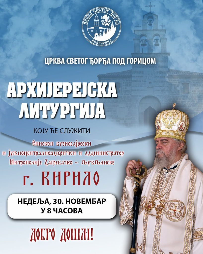 Његово преосвештенство Владика буеносајрески и јужноцентралноамерички и администратор Митрополије загребачко-љубљанске г. Кирило , служиће у недељу, 30. новембра Свету архијерејску литургију у Цркви Светог Ђорђа под Горицом.