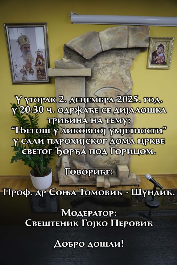 Дијалошка трибина на тему: „Његош у ликовној умјетности“ одржаће се сутра, 2. децембра у 20.30 сати у сали парохијског дома Цркве Светог Ђорђа под Горицом.