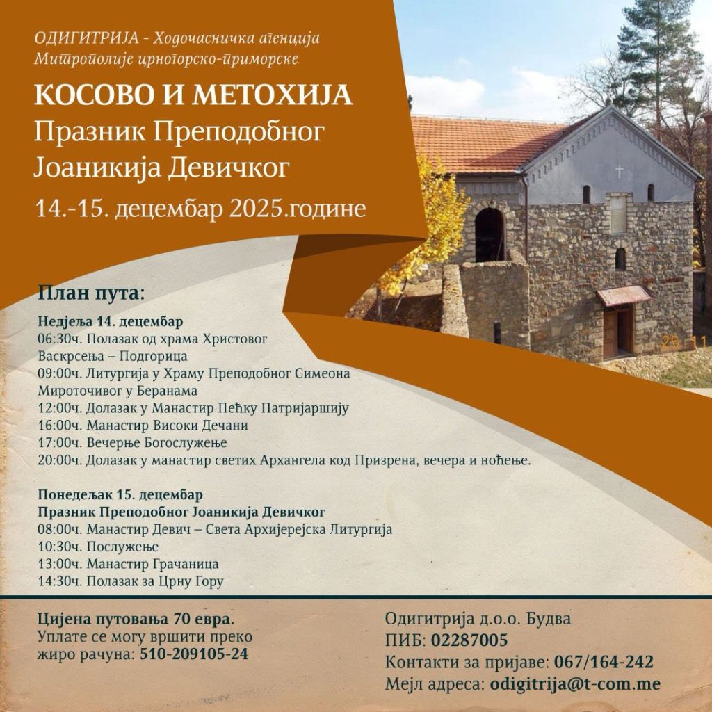 Одигитрија-Ходочасничка агенција Митрополије црногорско-приморске поводом празника Преподобног Јоаникија Девичког, 14. и 15. децембра организује поклоничко путовање на Косово и Метохију.
