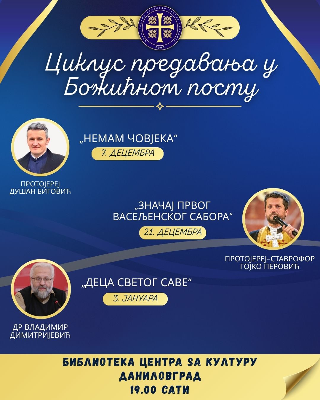 Православно братство Светог Арсенија из Даниловграда организује циклус предавања у Божићном посту, која ће се одржавати у библиотеци Центра за културу Даниловград.