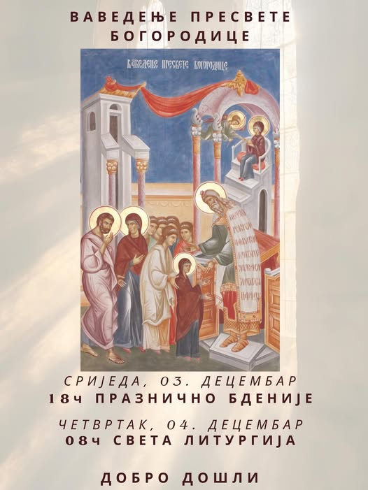 Поводом празника Ваведења Пресвете Богородице, у Цркви Светог Ђорђа под Горицом служиће се у сриједу, 3. децембра, празнично бденије са почетком у 18 сати, а Света литургија на дан празника, у четвртак 4. децембра са почетком у 8 сати.