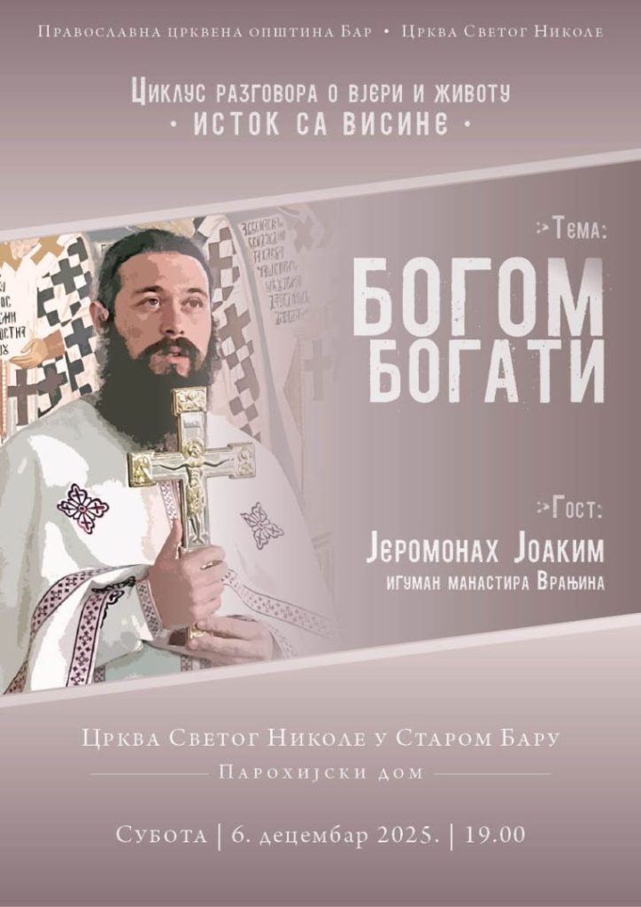Предавање ће бити одржано у парохијском дому Цркве Светог Николе у Старом Бару у суботу 6. децембра 2025. године са почетком у 19:00 часова.