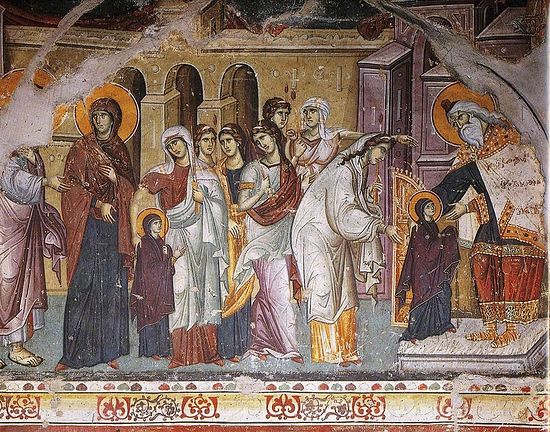 Кад је Дјева Марија напунила три године, родитељи су се с њом, у пратњи многобројне родбине, пешке упутили из Назарета у Јерусалим. Светом граду су се приближили у освит трећег дана. Пред њима је била чудесна слика – Храм на врху горе Морија личио је на лађу која је стајала у пристаништу са разапетим снежнобелим једрима. Чинило се да је спреман да се подигне увис и заплови по азурном небеском океану. Зраци излазећег сунца, који су се одбијали о златне иглице на крову Храма и снажно блистали, обавијали су Храм прозрачним облаком светлости који се преливао и сијао као нимбус. Иначе, кров Храма је био прекривен оштрим златним иглама да не би птице слетале на њега (Јосиф Флавије, „Јудејска историја“).