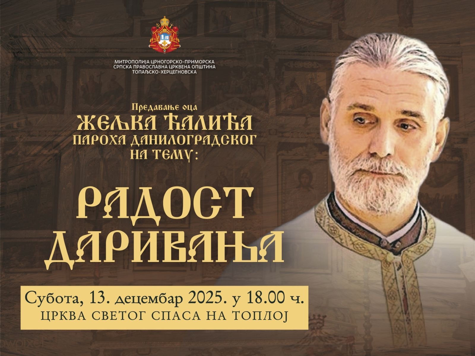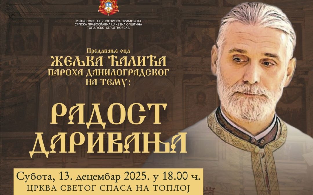 Протојереј Жељко Ћалић, парох даниловградски, одржаће у суботу, 13. децембра, са почетком у 18 часова, у Цркви Светог Спаса на Топлој, предавање на тему „Радост даривања“.