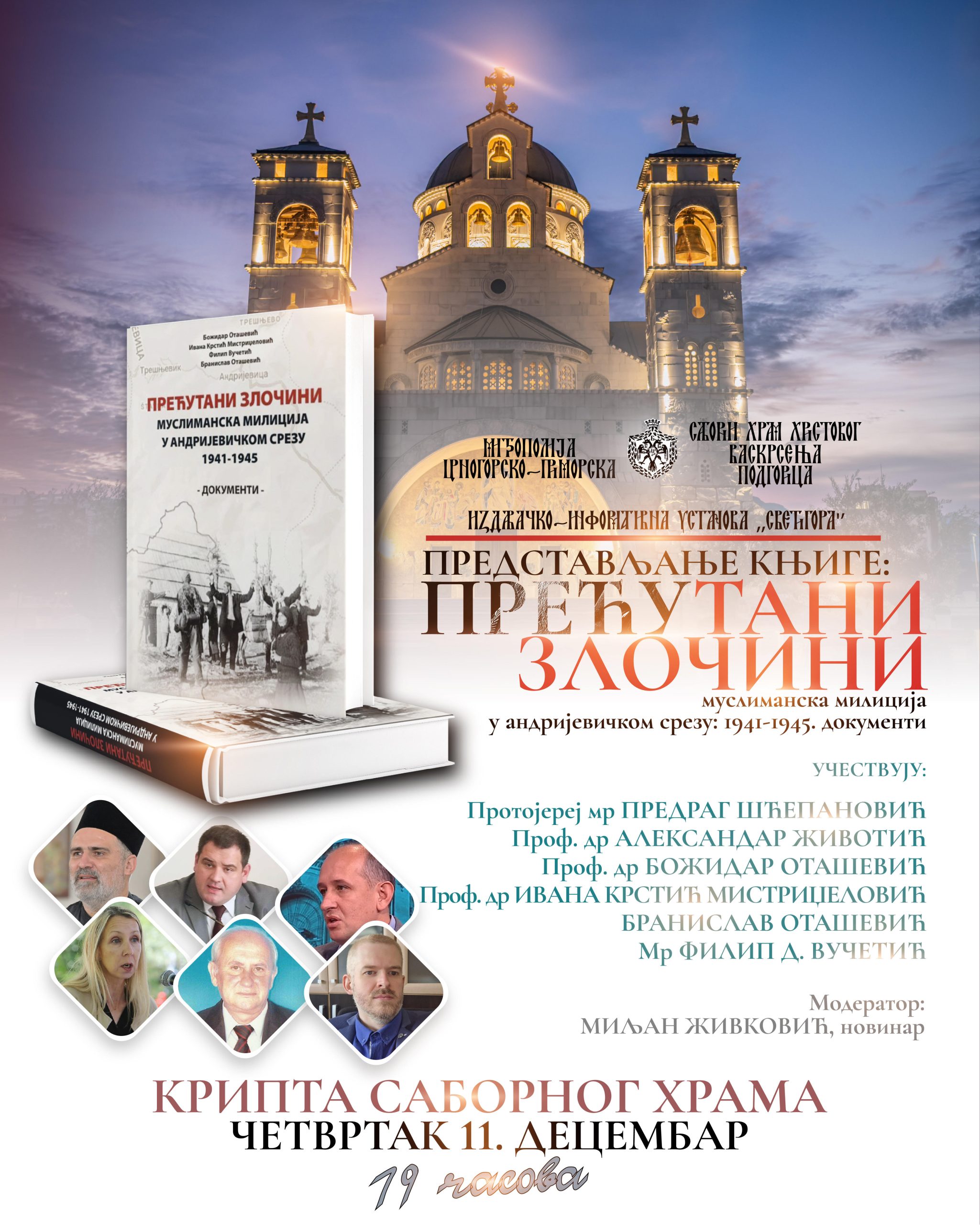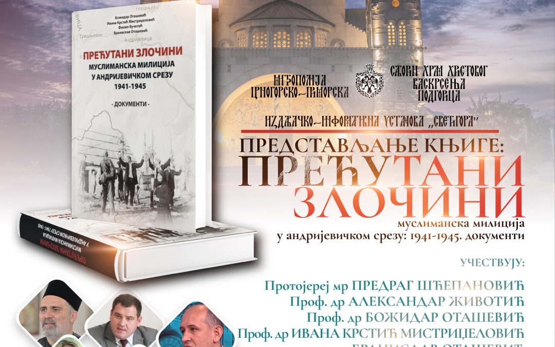 Књига, зборник докумената, „Прећутани злочини – муслиманска милиција у андријевичком срезу 1941-1945“ биће представљена читалачкој публици у крипти Саборног храма Христовог Васкрсења у Подгорици у четвртак, 11. децембра 2025. године, са почетком у 19 часова.