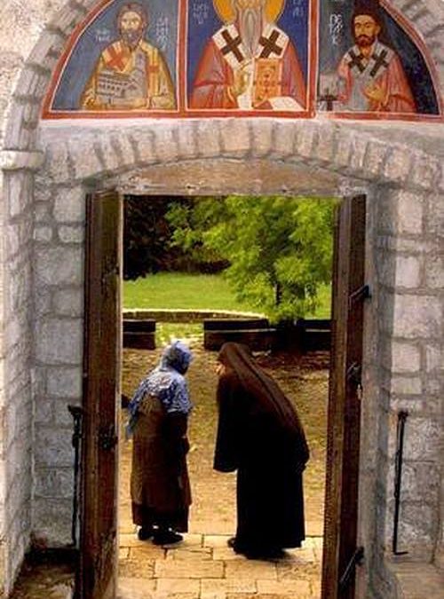 Фото: Слободанка Грдинић (отац Лука Анић и монахиња Јелисавета испред Цетињског манастира)