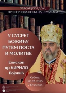 У оквиру Божићног циклуса предавања, у суботу, 20. децембра, са почетком у 19 часова, у Парохијском дому у Љубљани биће одржано предавање Његовог преосвештенства Епископа буеносајреског и јужно-централноамеричког др Кирила, администратора Епархије загребачко-љубљанске, на тему: „У сусрет Божићу, путем поста и молитве“.