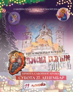 Дјечији хор ,,Свети апостол и јеванђелиста Марко” из Подгорице, одржаће у суботу 27. децембра, цјеловечерњи концерт под називом ,,Пјесма Божићне радости” у крипти Саборног храма Христовог васкрсења у Подгорици.