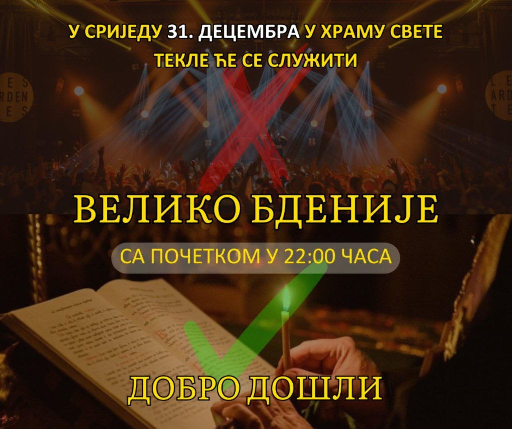 У Саборним храму Свете Текле у Даниловграду вечерас, 31. децембра 2025. године, служиће се велико бденије, са почетком у 22 часа.