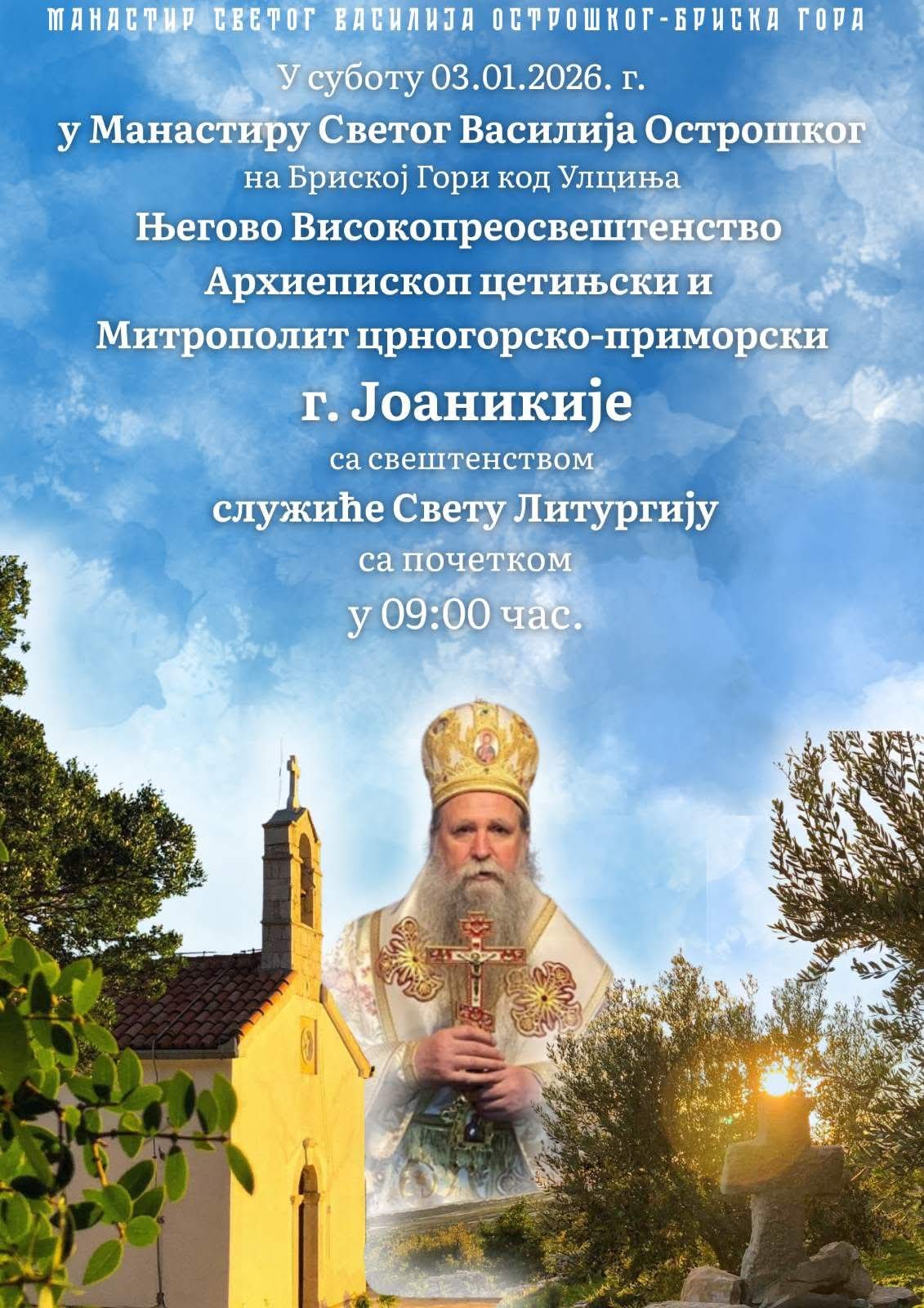 Његово високопреосвештенство Архиепископ цетињски Митрополит црногорско-приморски г. Јоаникије у суботу, 3. јануара 2026. године, са свештенством и вјерним народом служиће Свету литургију у Манастиру Светог Василија Острошког на Бриској гори код Улциња, са почетком у 9 часова.
