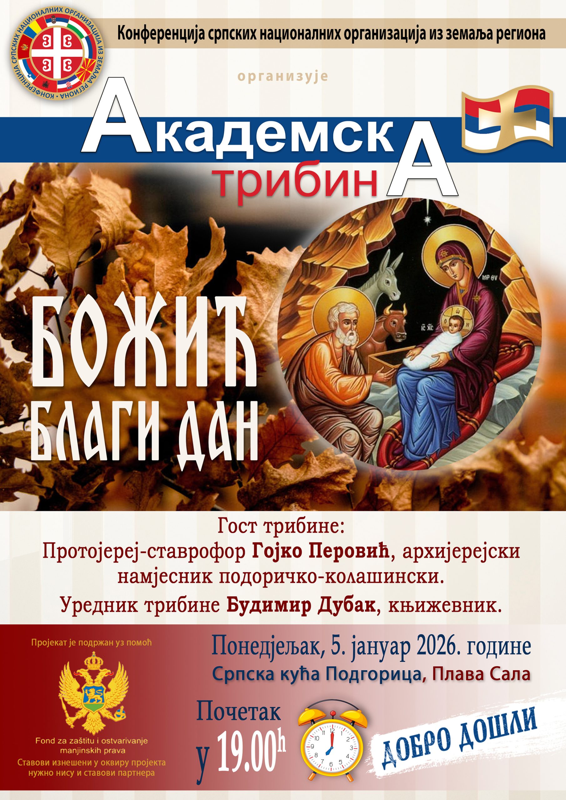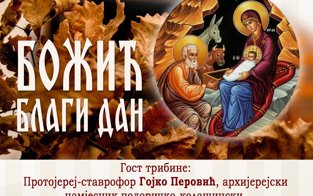 Конферениција српских националних организација из земаља региона, у сусрет најрадоснијем хришћанском празику, организује Академску трибину „Божић благи дан“, на којој ће предавање одржати протојереј-ставрофор Гојко Перовић, архијерејски намјесник подгоричко-колашински. Уредник трибине је Будимир Дубак, књижевник.
