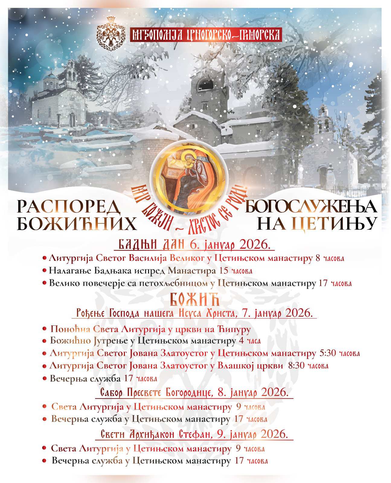 Благосиљање и налагање бадњака испред Цетињског манастира обавиће Његово високопреосвештенство Архиепископ цетињски и Митрополит црногорско-приморски господин Јоаникије у 15 часова.