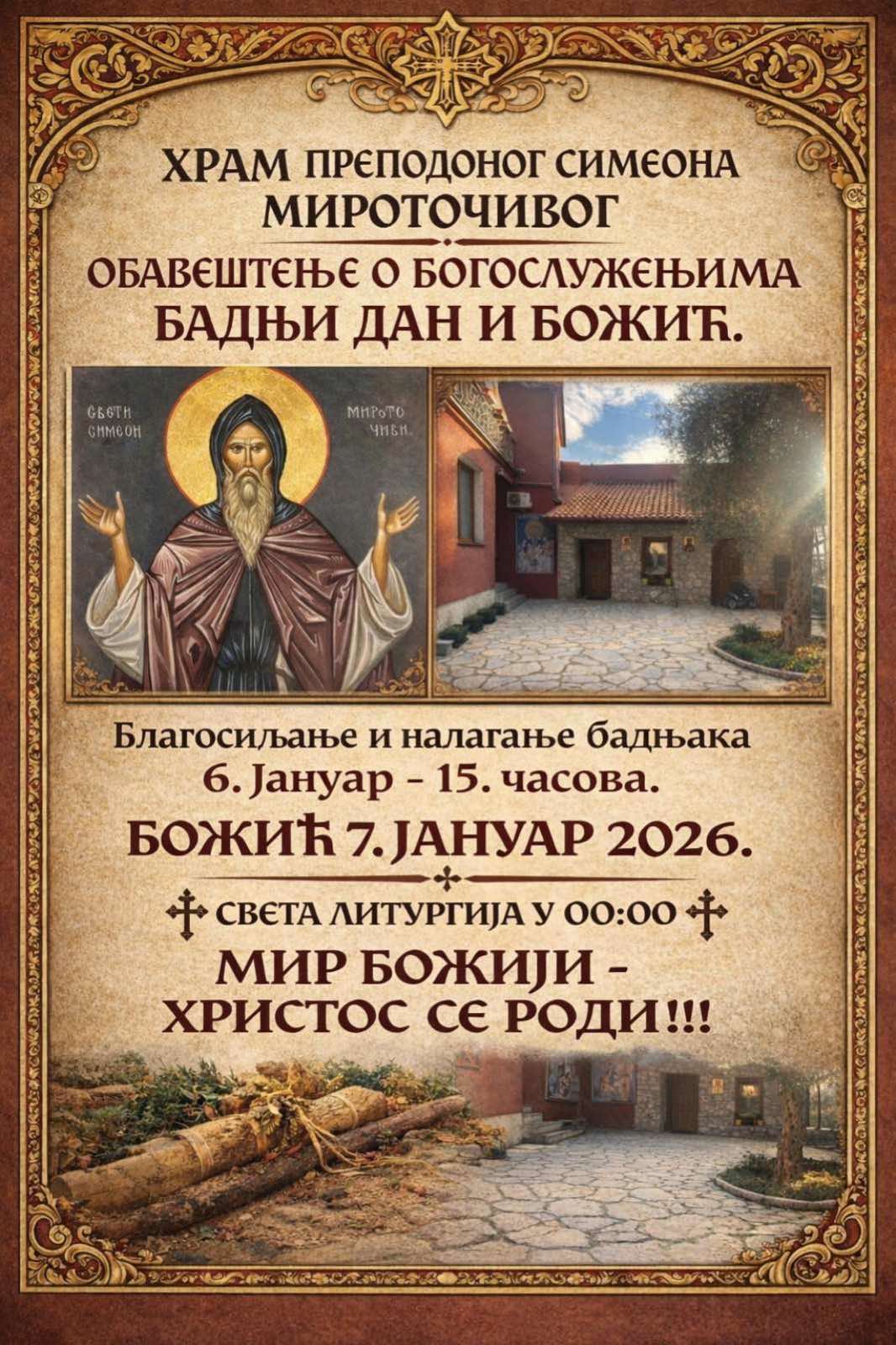 Налагање бадњака испред Храма Преподобног Симеона Мироточивог обавиће се у 15 часова.