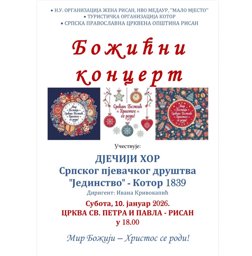 Божићни концерт Дјечијег хора Српског пјевачког друштва „Јединство“ – Котор 1839, под диригентском руководством Иване Кривокапић, биће одржан данас, 10. јануара, у Цркви Светих апостола Петра и Павла у Рисну, са почетком у 18 сати.