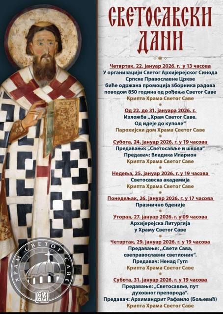 Програм почиње у четвртак, 22. јануара 2026. године, у 13 часова, када ће у крипти Храма Светог Саве у организацији Светог Архијерејског Синода Српске Православне Цркве, бити одржана свечана промоција зборника радова поводом 850 година од рођења Светог Саве.