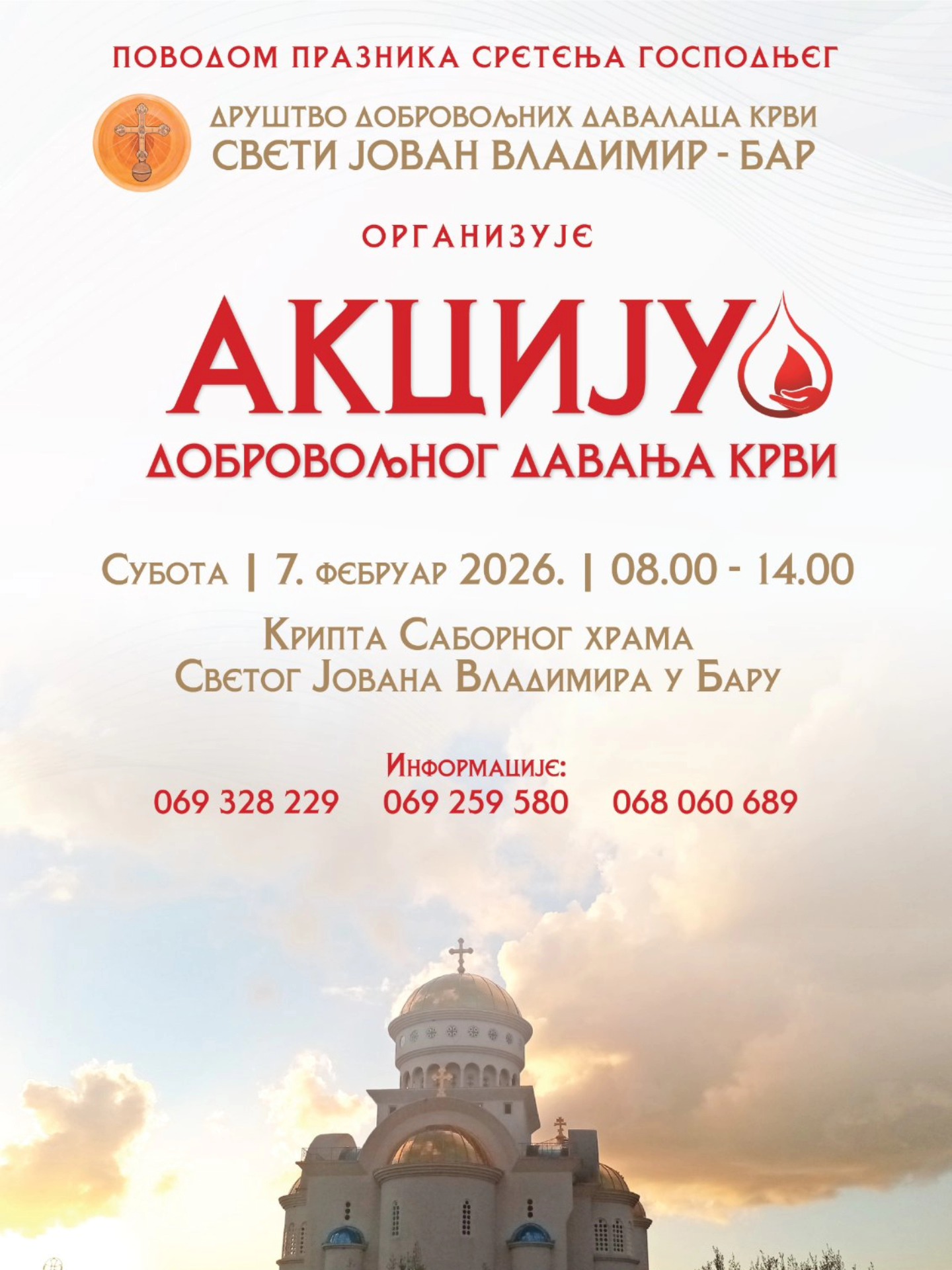 Поводом прославе празника Сретење Господње, Друштво добровољних давалаца крви „Свети Јован Владимир“ организује нову акцију добровољног давања крви.