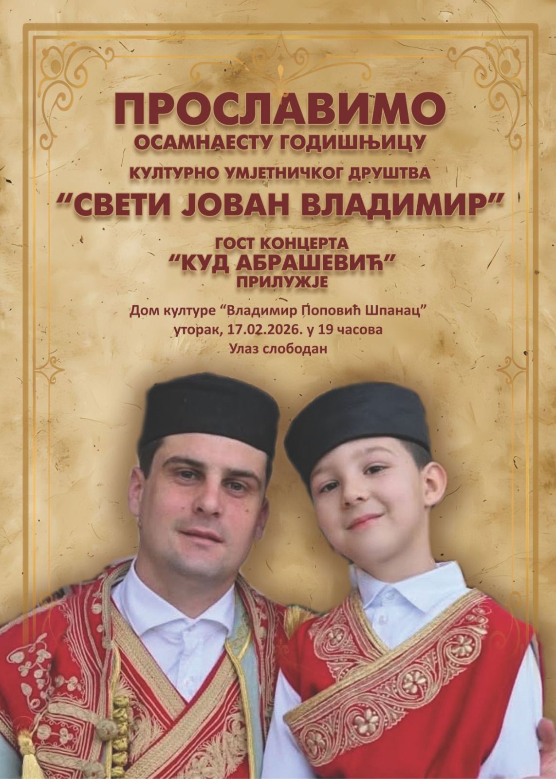 Концерт се одржава поводом прославе осамнаестогодишњице од оснивања КУД-а ”Свети Јован Владимир”.