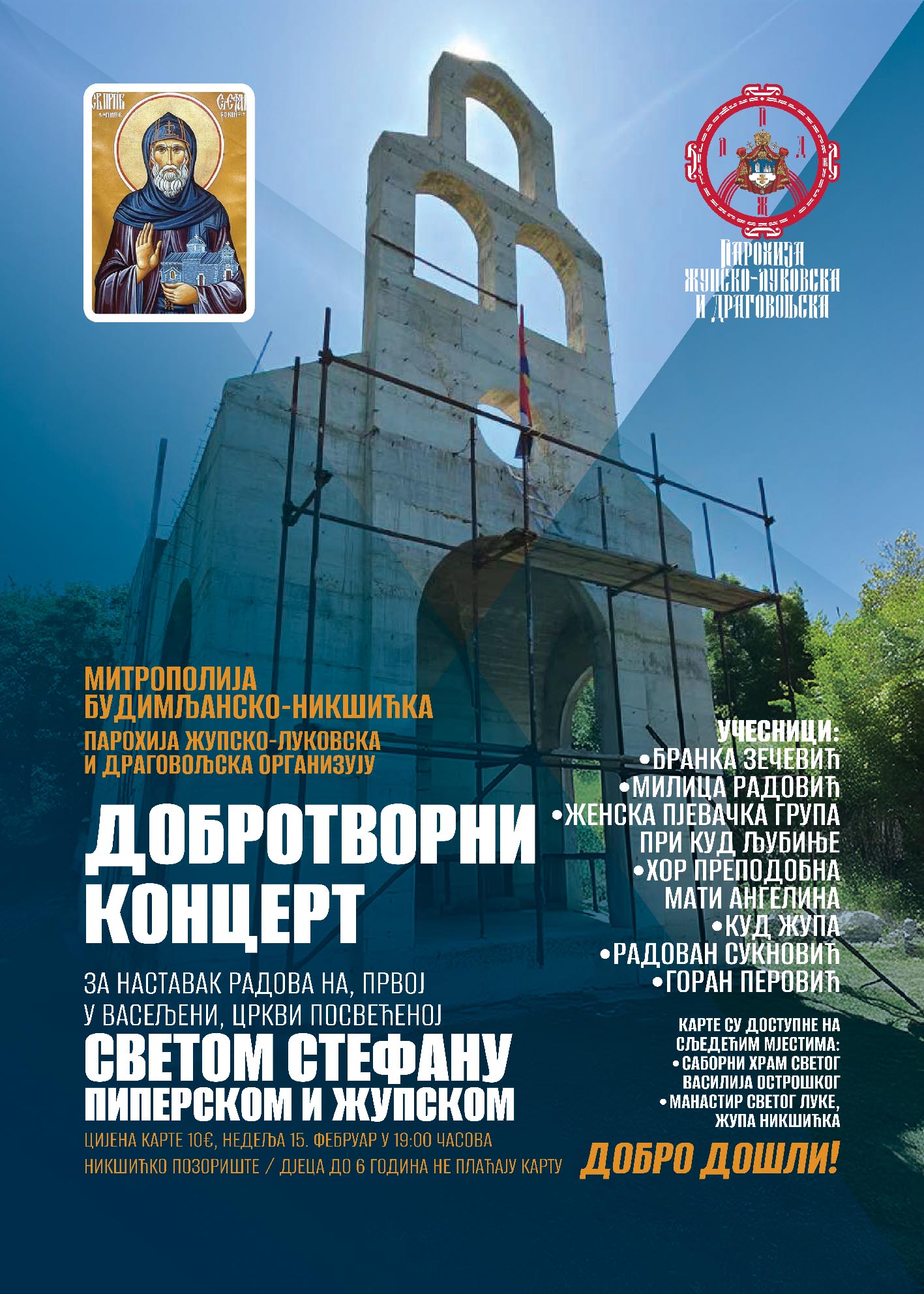 Епархија будимаљанско-никшићка и Парохија жупско- луковска и драговољска у недјељу, 15. фебруара, организују донаторско вече за наставак градње цркве која је посвећена Светом Стефану Пиперском и Жупском у мјесту Губељ – село Кута у Жупи никшићкој.