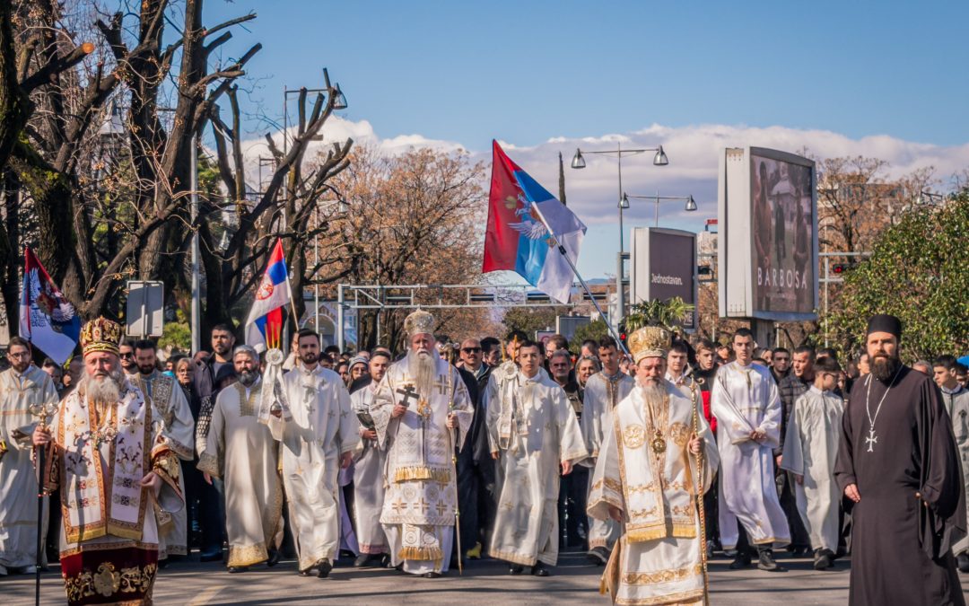 Након Литургије, предвођени архијерејима свештенство, монаштво и више хиљада вјерника, родитеља и дјеце кренуло је у традиционални крсни ход од Саборног храма до Немањиног града, гдје су освештани славски дарови-колач и жито.