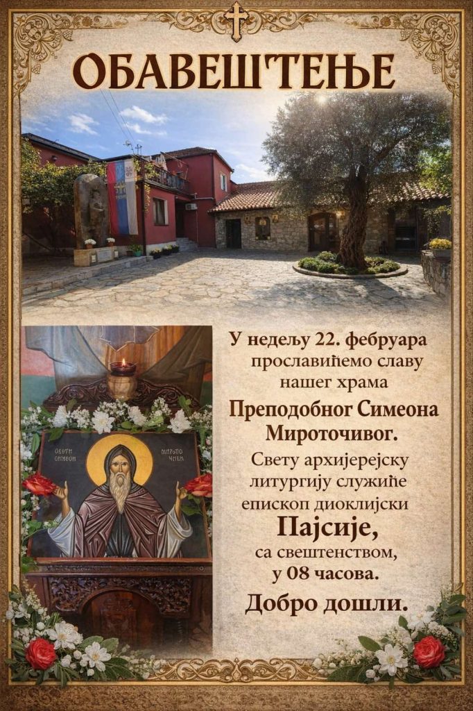 Свету архијерејску литургију са почетком у 8 сати, служиће Његово преосвештенство Владика диоклијски г. Пајсије.