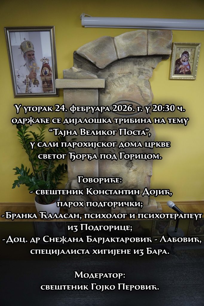 Дијалошка трибина на тему „Тајна Великог поста“ одржаће се у уторак, 24. фебруара у 20.30 сати у сали парохијског дома Цркве Светог Ђорђа под Горицом.