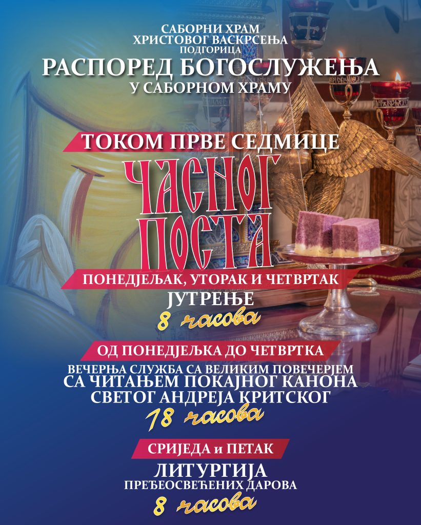 У Саборном храму Христовог васкрсења у Подгорици распоред богослужења у првој седмици Васкршењег поста је сљедећи:
