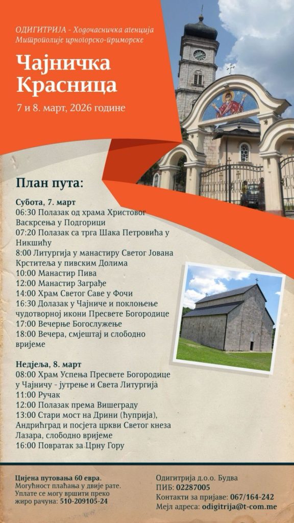 Одигитрија- Ходочасничка агенција Митрополије црногорско-приморске, 7. марта организује поклоничко путовање у Чајниче.