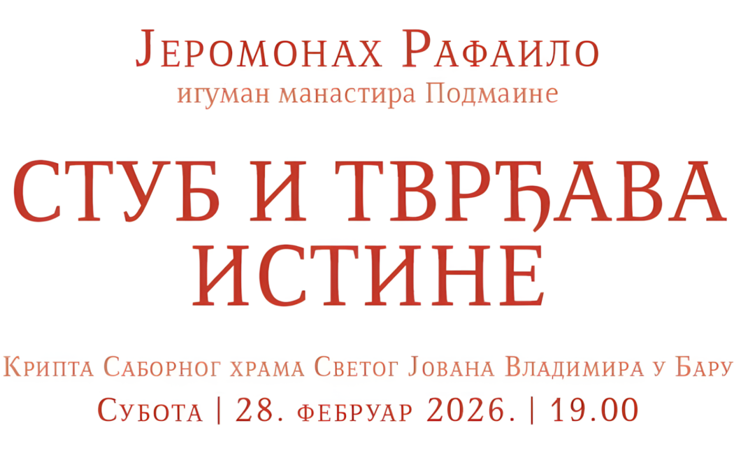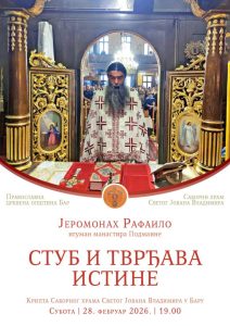 Сваке године у току Великог поста Црквена општина Бар и Саборни храм Светог Јована Владимира суботом вече организују серију великопосних предвања. Ове суботе, 28. фебруара, са почетком у 19 часова, предавње на тему „Стуб и тврђава истине“ одржаће јеромонах Рафаило (Бољевић), игуман манастирa Подмаине.