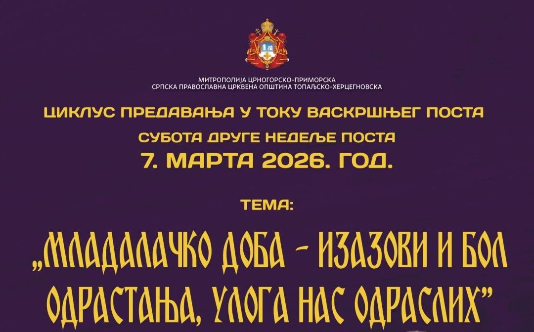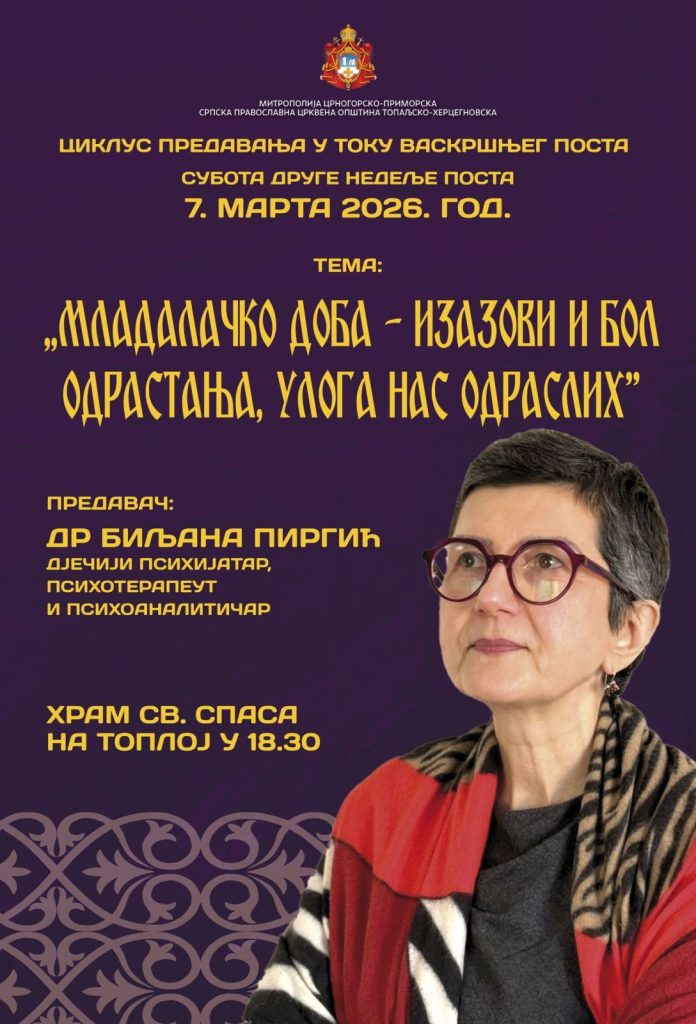 У оквиру циклуса предавања у току Часног поста које организује Црквена општина топаљско-херцегновска, у суботу 7. марта са почетком у 18.30 у Храму Светог Спаса на Топлој, предавање на тему „Младалачко доба – изазови и бол одрастања, улога нас одраслих„, одржаће др Биљана Пиргић, дјечији психијатар, психотерапеут и психоаналитичар.