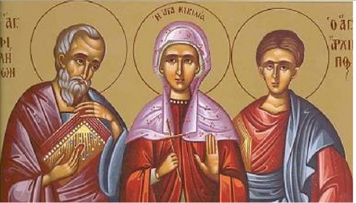 Свети апостол Архип, један од Седамдесеторице, беше после Светог Епафраса епископ у Фригијском граду Колосима, по сведочанству Светог Амвросија. Зато га у својој посланици Филимону Свети апостол Павле назива својим другаром у војевању. А Свети Филимон беше угледан грађанин у Колосима. За Свету пак Апфију, Свети Златоуст каже да је била Филимонова супруга. Овај Свети Филимон када верова у Христа, дом свој начини црквом, јер се ту сабираху сви хришћани из Колоса, и у дому његовом као у цркви вршаху богослужења. Потом Свети Филимон би од апостола рукоположен за епископа ради апостолства. Јер у то време Свети апостоли рукополагаху своје ученике за епископе, и то неке од њих на стално место, а неке као мисионаре путујуће по разним местима. Ови путујући епископи називали су се апостолствујући епископи, јер су били слати на апостолску проповед. И Свети Филимон је био један од таквих епископа, увршћен у лик свете Седамдесеторице апостола. Путовао је по фригијским и другим градовима, проповедајући реч Божју. А пише за њега да је био и у Гази епископ.