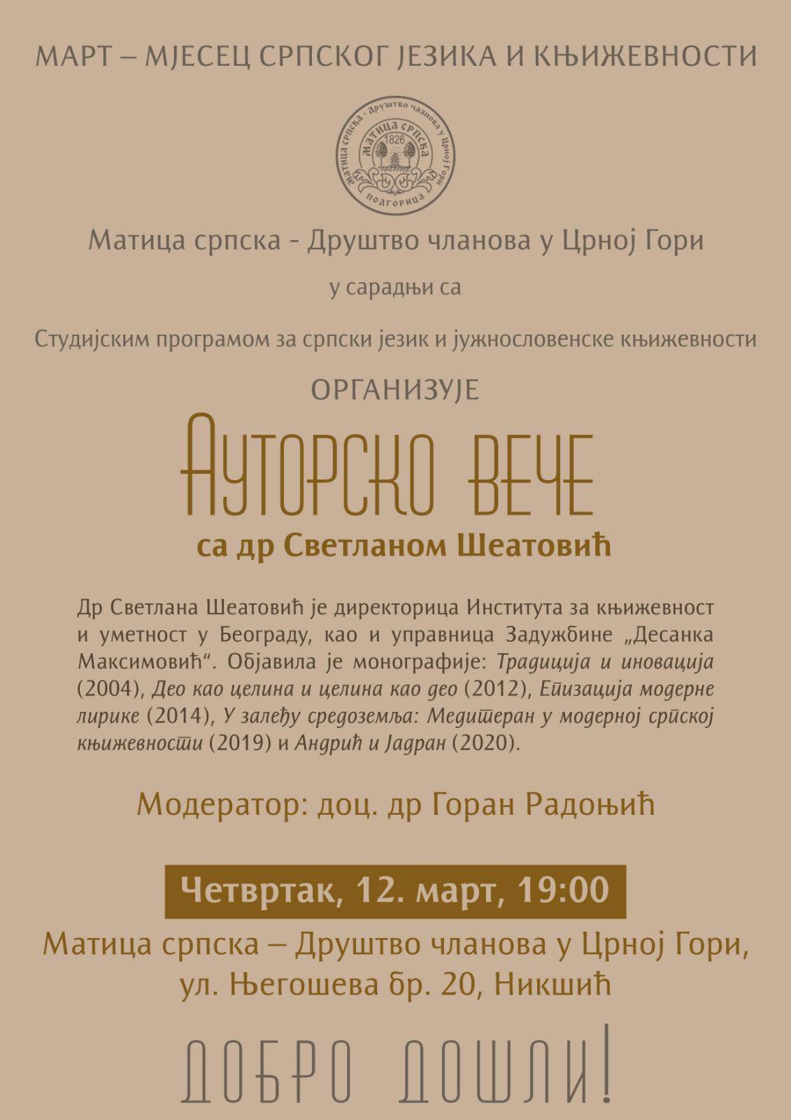 Матица српска – Друштво чланова у Црној Гори у сарадњи са Студијским програмом за српски језик и јужнословенске књижевности организује у четвртак, 12. марта у 19 часова, у својим просторијама у Никшићу, Ауторско вече са др Светланом Шеатовић.